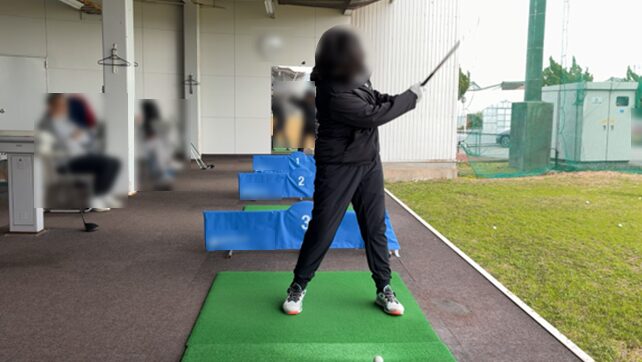 このようなバックスイングとフォローのバランスなら、いろんなライからでも綺麗にボールへコンタクトできて、ソールの抜けもよくなります。